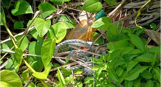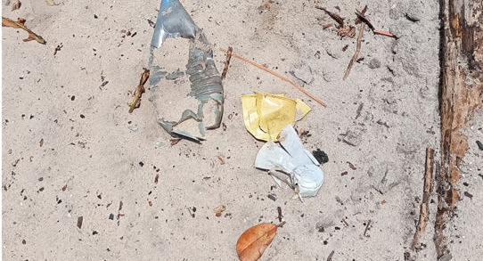 Olhando a praia de relance, ela não parece muito suja, mas é um olhar enganoso, pois há muita sujeira inorgânica escondida espalhada pelos mais diversos caminhos, reentrâncias de pedra e até mesmo na areia. Infelizmente. Garrafas de vidro e cacos de outras garrafas foram os objetos mais perigosos que encontramos. Também, camisinhas usadas e muitos lenços do tipo umedecidos revelaram que uma das regras pétreas do naturismo está sendo constantemente quebrada. Infelizmente também encontramos alguns cones de cocaína, o que, juntamente com a norma que não permite atividades sexuais em áreas de naturismo, configura crime pelo Código Penal brasileiro.